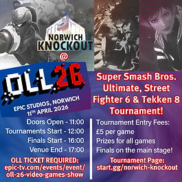 On Saturday 11th April, Norwich Knockout moves to OLL '26 as we run competitions for Super Smash Bros. Ultimate, Street Fighter 6 & Tekken 8.